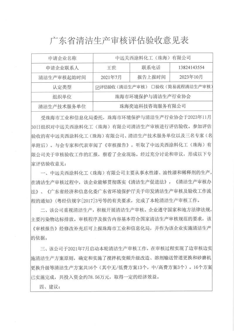 根据珠海市工业和信息化局委托,珠海市环境保护与清洁生产行业协会于2023年11月 30日组织对中远关西涂料化工(珠海)有限公司清洁生产审核已完成评估验收,现进行公示。